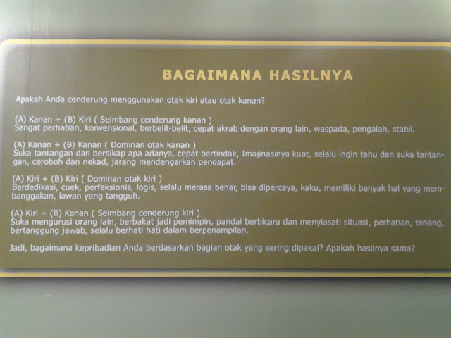 - tes A : kanan + tes B : kanan ---> (dominan otak kanan) : suka tantangan dan bersikap apa adanya, cepat bertindak , imajinasi kuat, selalu ingin tahu dan suka tantangan, ceroboh dan nekad, jarang mendengarkan pendapat